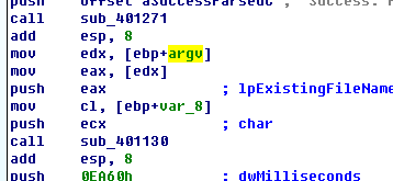 b分支调用了CopyFileA这个函数,这是衣蛾复制文件的函数。它有两个参数,一个是源文件。这里的目标位置是“C:\Temp\cc.exe”,而源文件就是当前的程序。这个分支的目的就是将Lab06-03.exe复制到C:\Temp\cc.exe: