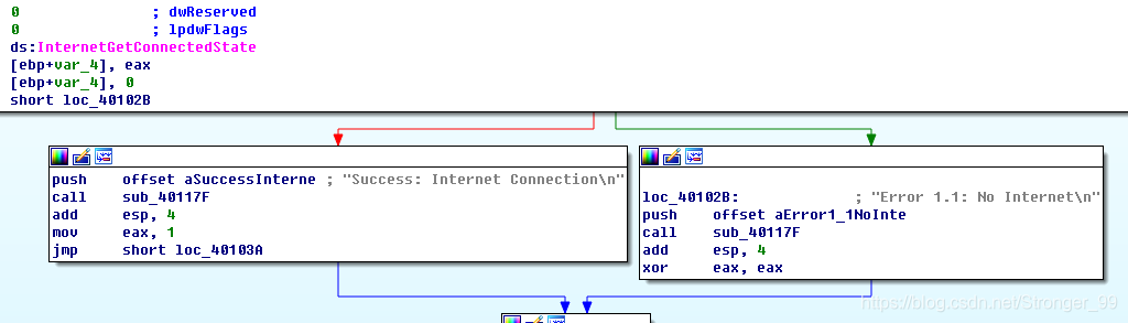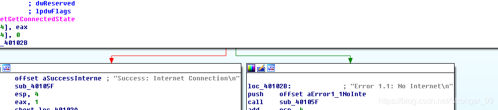 这里调用了一个InternetGetConnectedState函数,这是用来连接网络状态的。两个分支,一个成功一个错误,这是一个典型的if语句。