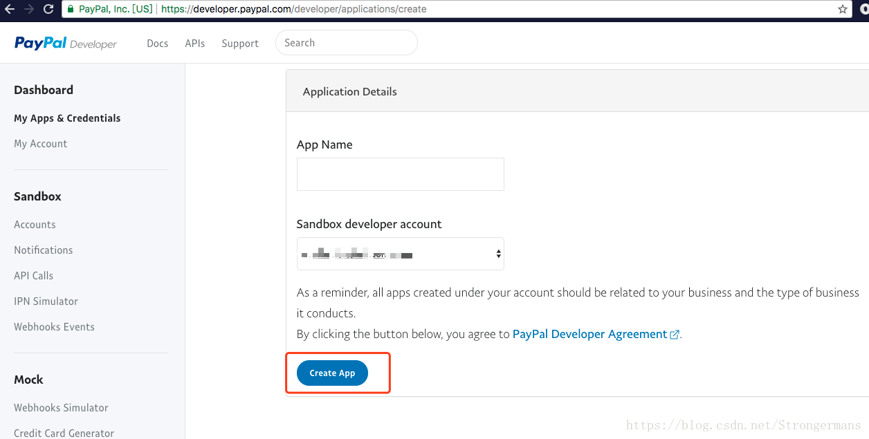 第八步:上一张图中的账号选择商家的的测试账号作为生成test的账号,然后点击Create App