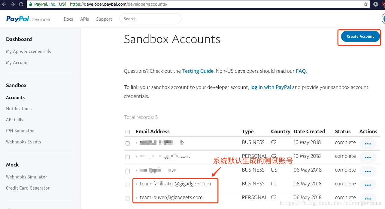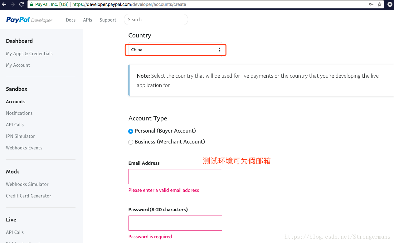 第五步:创建个人和商家测试账号,其中国家选中国,测试环境的邮箱可以是假邮箱