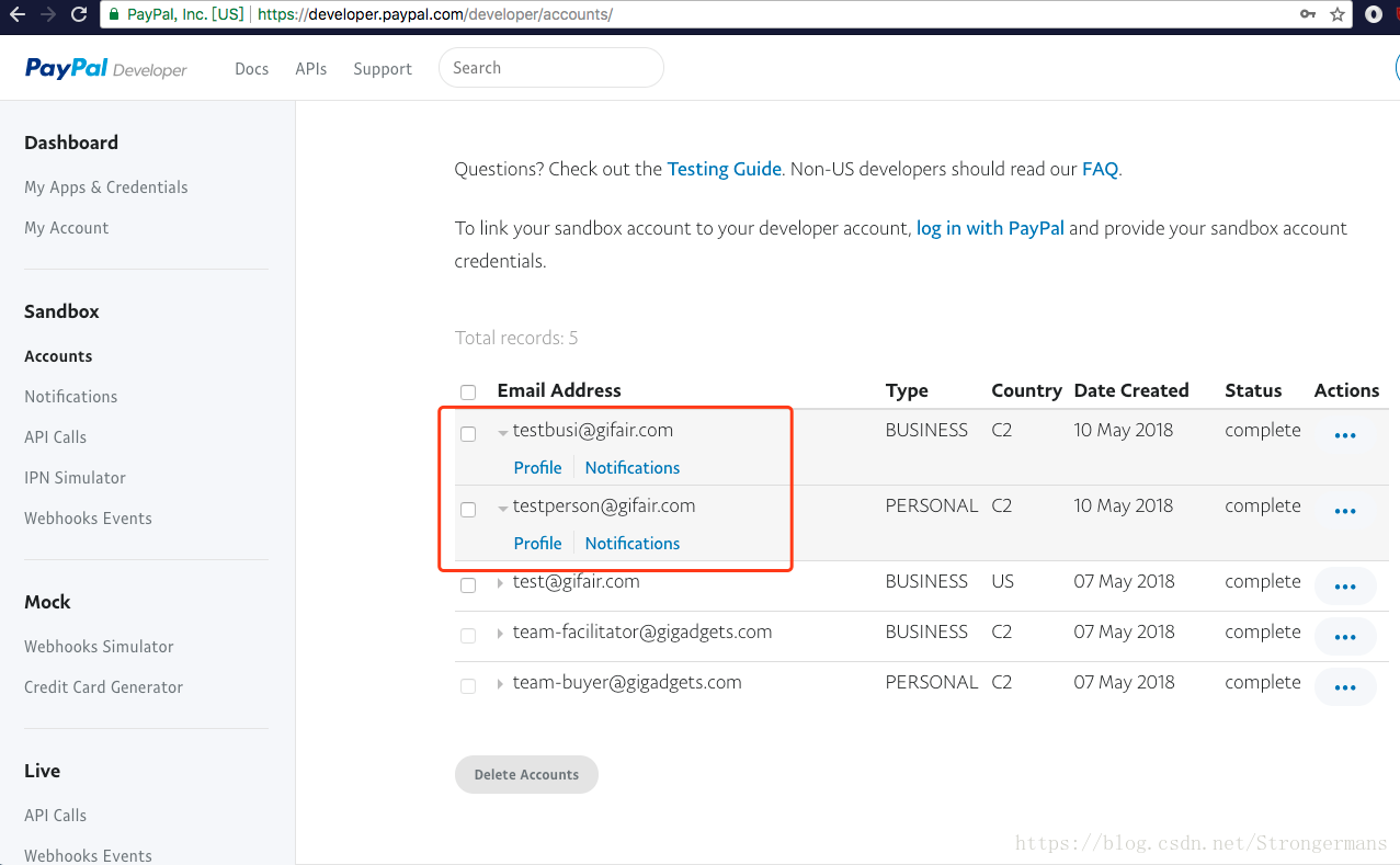 第六步:点击左边导航栏里的sandbox的accounts,回到accounts页面就能看见我们之前创建的测试账号了