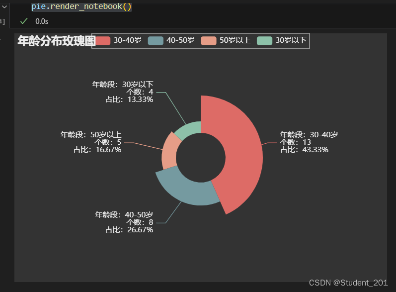 以上就是今天要讲的内容,本文简单介绍了pyecharts的使用,同时在学习pyecharts的过程中巩固了对于数据结构的重组,数据分箱,也建立起了对制作图形的标准型状的要求的高标准,以后会完善自己学习所得的知识。