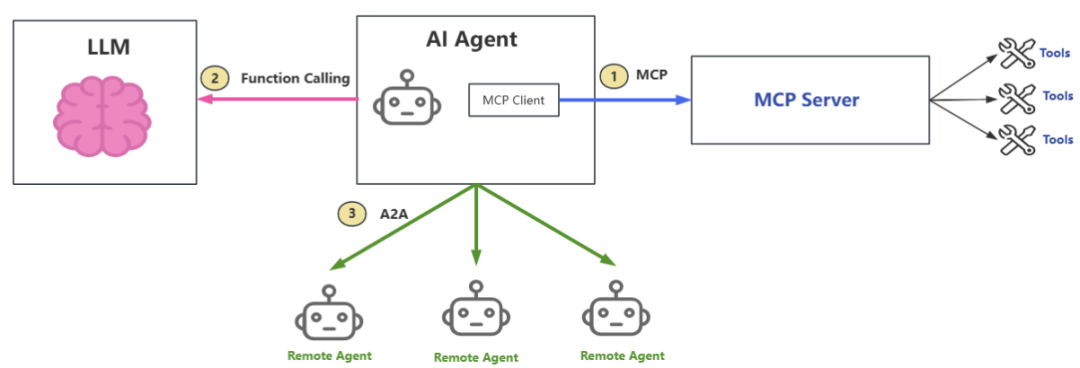 在这场关于智能体(AI Agent)的进化革命中,背后隐藏着三个关键“武器”:MCP(Model Context Protocol)、Function Calling和A2A(Agent to Agent protocol)。简单来说,MCP、Function Calling和A2A分别代表三种AI Agent和外界不同的协作方式: