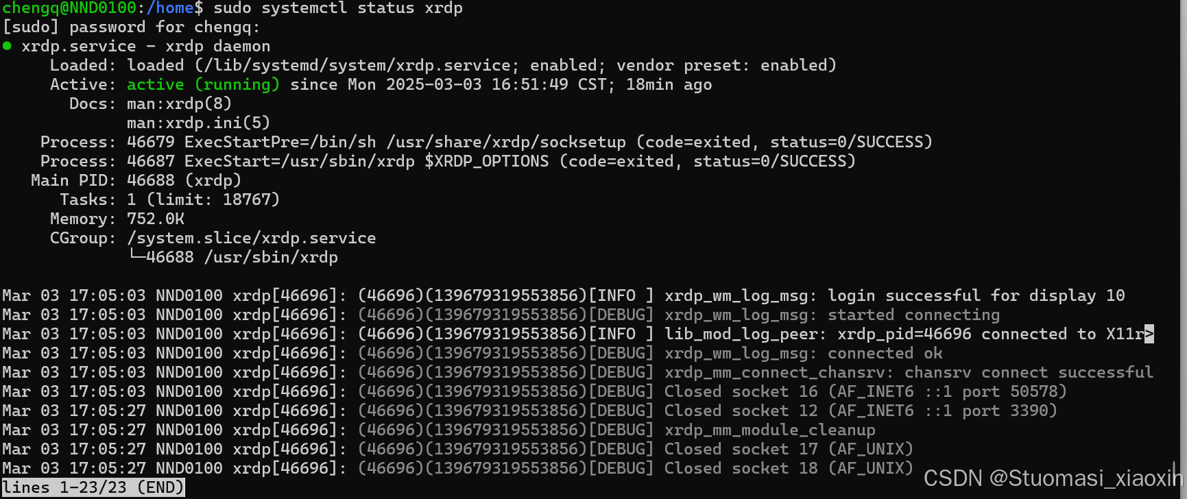 修改完 .xsession 文件并清理缓存后,重启 xrdp 服务: