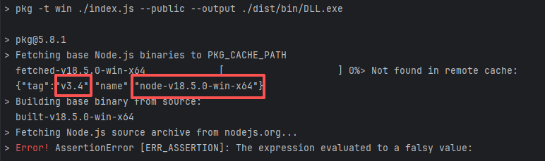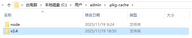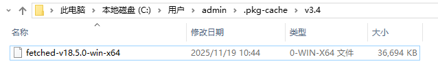 在当前 .pkg-cache 文件夹中创建 v3.4 文件夹,并将 fetched-v18.5.0-win-x64 文件放入其中
