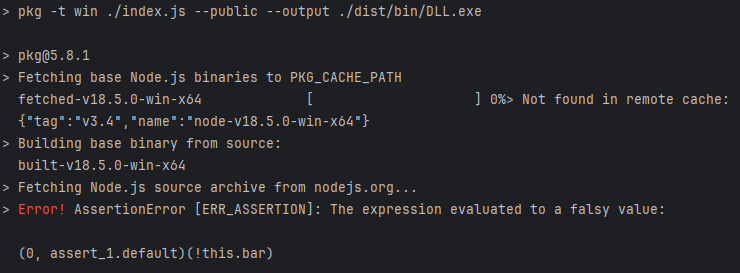 尝试使用pkg打包nodejs软件时,报错如下图所示