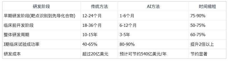 从表格中可以看出,AI在药物研发的各个环节都有显著的优势,不仅大大缩短了研发时间,还提高了成功率,降低了成本。