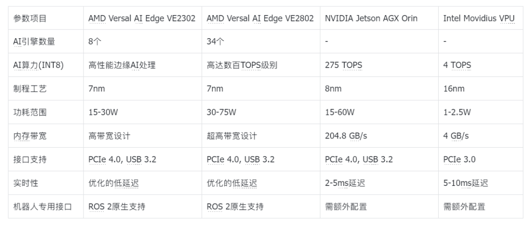 从表格中可以看出,AMD Versal AI Edge系列在AI算力、内存带宽和实时性方面都占据明显优势。特别是其自适应AI引擎设计,能够根据不同应用场景动态调整计算资源分配,这在机器人应用中尤为重要。