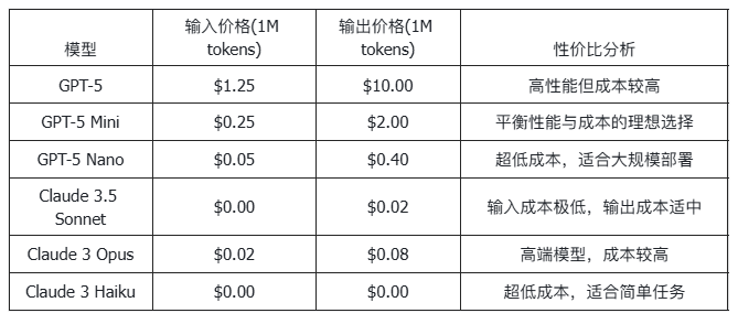 OpenAI采取了分层定价策略,从高端的GPT-5到低成本的GPT-5 Nano,覆盖不同需求层次。而Anthropic的Claude系列在输入成本上具有明显优势,特别适合需要处理大量输入数据的场景。值得注意的是,GPT-5的输出成本显著高于Claude,这使得在需要生成大量内容的场景中Claude更具成本效益。