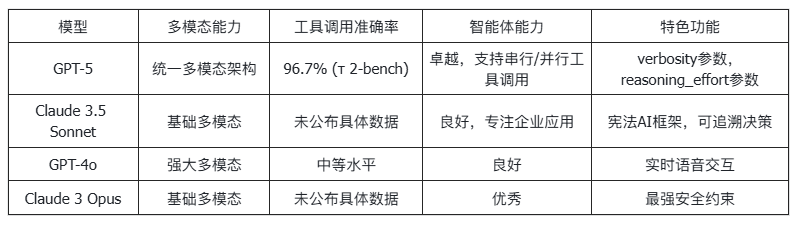 GPT-5在工具智能方面实现了重大突破,96.7%的工具调用准确率使其在复杂智能体任务中表现卓越。其新增的verbosity和reasoning_effort参数为开发者提供了前所未有的控制能力。Claude则通过其独特的宪法AI框架在安全性和可解释性方面保持领先。