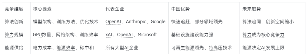 早期的AI竞争主要集中在算法创新上,谁能设计出更高效的模型架构,谁就能占据优势。但随着技术的发展,算法创新的空间逐渐缩小,竞争的焦点正在转向更为基础的层面——能源供给与硬件制造能力。