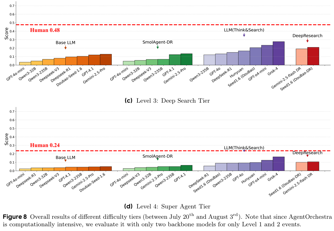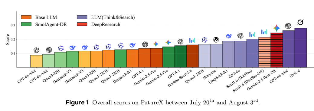 在2024年7月20日至8月3日的评估期间,FutureX对25个模型进行了全面测试,这些模型分为四类:8个基础LLM、7个具备思考搜索能力的LLM、8个开源深度研究代理和2个闭源深度研究模型。