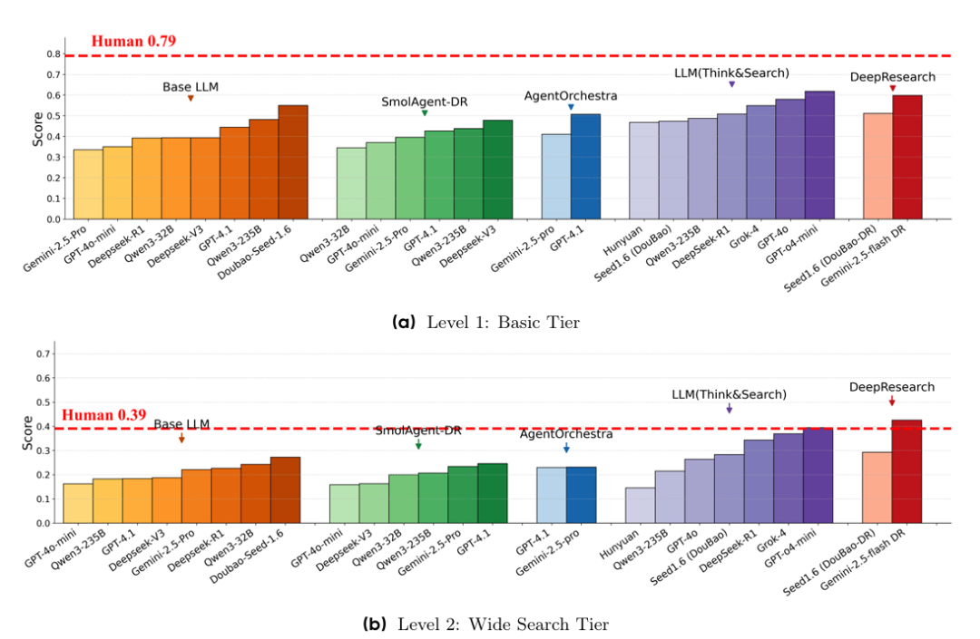研究发现,基础模型在简单任务上表现良好,甚至超过某些具备搜索工具的代理。例如,DouBao-Seed1.6-Thinking在Level 1和Level 2任务上的表现优于许多搜索增强模型。