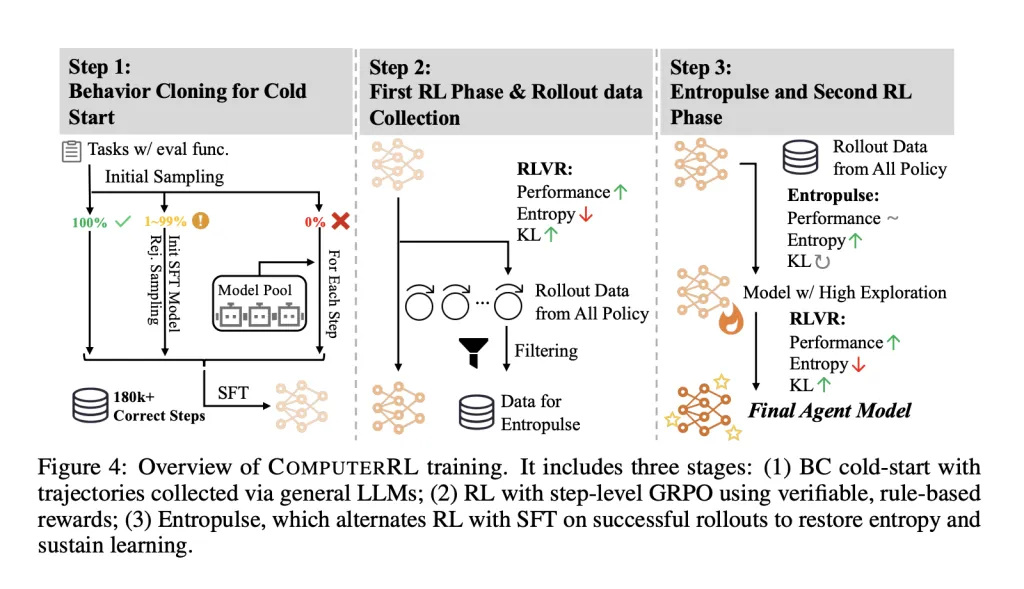 ComputerRL引入了一个叫Entropulse的方法来解决这个问题。它会在强化学习阶段和监督微调之间交替进行,用成功轨迹的数据来恢复探索性,让AI保持学习的动力。