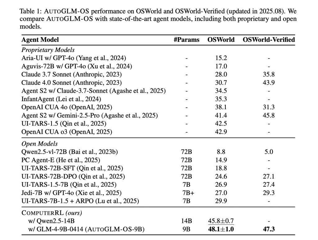 研究团队将ComputerRL应用到GLM-4-9B-0414和Qwen2.5-14B等开源模型上,产生了AutoGLM-OS系列变体。在OSWorld基准测试中,AutoGLM-OS-9B取得了48.1%的成功率,超过了OpenAI的CUA o3(42.9%)和Claude 4.0(30.7%)等专有模型。在OSWorld-Verified测试中也达到了47.3%的成绩。