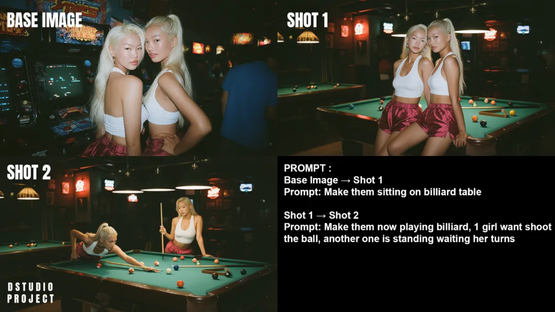 让两人坐在台球桌边上,又让她们开始打台球,图片来源:X@D_studioproject