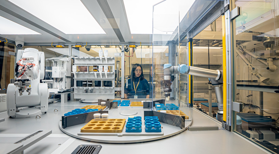 图:A-Lab内部,机器人系统正在执行材料合成任务。