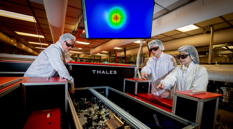 图:科学家在BELLA中心调整精密光学元件,AI系统在后台保障激光束的稳定。
