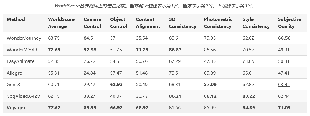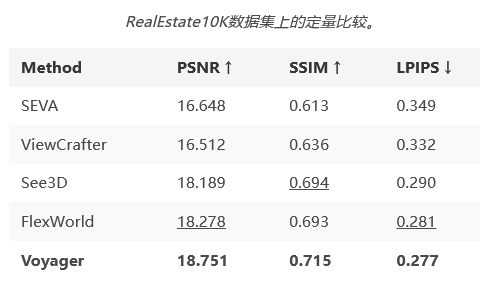 Voyager在所有指标上都实现了全面领先,可以说是毫无悬念地拿下了第一。PSNR指标达到了18.751,比第二名高了将近0.5;SSIM指标是0.715,同样力压群雄;LPIPS指标则是越低越好,Voyager的0.277是全场最低分,说明它生成的内容在人眼看来和真实的视频最像。