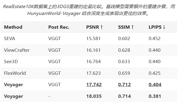 接下来是更硬核的场景生成质量评估。因为对手们都只能生成RGB帧,研究团队还挺“贴心”地先用一个叫VGGT的工具帮它们估计相机参数,再用它们生成的视频来初始化点云。而Voyager这边就轻松多了,因为它直接生成RGB-D内容,根本不需要任何中间处理,就能直接拿去做高质量的3D Gaussian Splatting (3DGS) 重建。