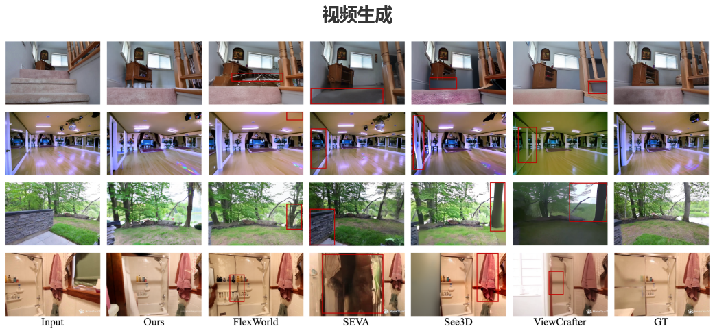 这一招的厉害之处在于:首先,它是多模态联合生成,RGB视频和深度视频同步产出,而且保证精确对齐,直接省去了后期处理的麻烦,数据质量还高。其次,它通过一个基于现有世界观测的条件生成机制,确保你生成的视频不管拉多长,从头到尾在视觉上和几何结构上都是统一的,不会出现走着走着墙歪了、桌子没了的诡异情况。最后,它还是端到端生成,不像老办法那样需要COLMAP这类额外的3D重建工具来“打补丁”,天生就保证了跨帧的一致性。