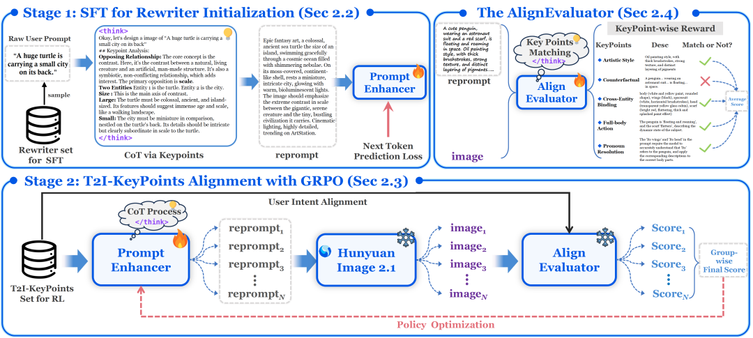 当然,光有技术还不行,还得有“品味”。HunyuanImage-2.1引入了人类反馈强化学习(RLHF,Reinforcement Learning from Human Feedback)技术。简单来说,就是让真人来给AI生成的图片打分,告诉它什么是美的,什么是符合要求的。通过这种“魔鬼训练”,AI的审美水平和对人类意图的理解能力会持续进化,越来越懂你。