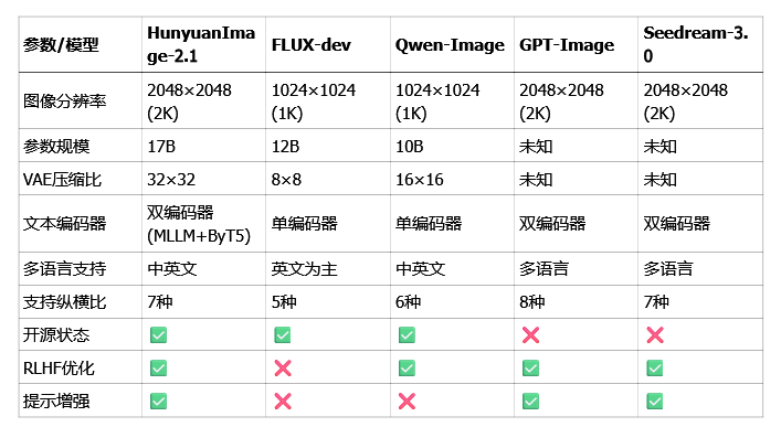 为了让大家看得更直观,我们再来横向对比一下几个主流模型的关键参数,看看HunyuanImage-2.1的“肌肉”到底有多结实。