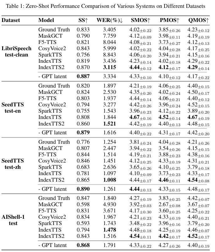 说了这么多,IndexTTS2到底有多强?不吹不黑,直接上数据。B站团队在好几个公开的基准测试集上,把它和当前市面上最顶尖的几个零样本TTS系统拉到一块儿。结果?IndexTTS2几乎是全方位碾压。