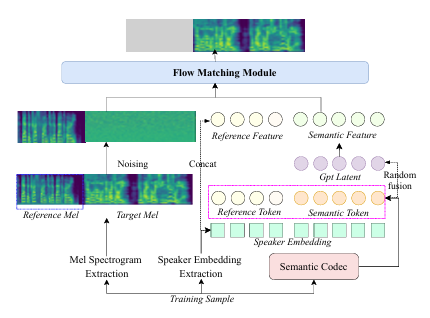 S2M模块,可以理解为一位才华横溢的作曲家。它采用了一种基于流匹配(Flow Matching)的非回归生成框架,任务是把T2S大脑输出的语义token“翻译”成梅尔频谱图(你可以把它想象成一种非常精细的声波乐谱)。这里用到了条件流匹配(CFM (条件流匹配))技术,学习一个常微分方程(ODE (常微分方程)),这个方程能引导样本从一堆随机噪声,一步步“进化”成目标梅尔频谱图。为了解决在表现深度情感时声音可能变糊的问题,S2M模块还加了两个“外挂”:一是利用从BERT模型里提取的文本表示作为辅助输入;二是把T2S模块的GPT潜在特征也拿来当补充信息。这个操作,让最终生成的声学特征发音更准、语义更流畅。
