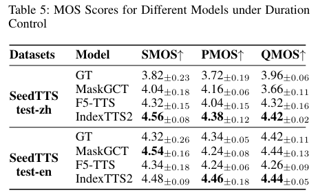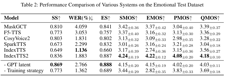 为了证明模型里的每个零件都有用,团队还做了消融实验。简单说,就是故意拿掉模型的一些部件,看看会发生什么。结果发现,如果拿掉GPT潜在特征,模型的各项指标立马下降,尤其是在声音清晰度上;如果把S2M模块换成MaskGCT的S2A模块,说话人相似度和词错误率会变得很糟。这充分证明了IndexTTS2的每一部分设计都是经过深思熟虑且不可或缺的。