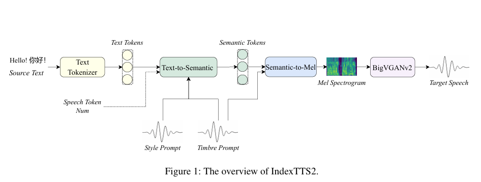 IndexTTS2这么牛,它的内部构造肯定不简单。整个模型就像一个高度协同的精密工厂,由三大核心模块组成:Text-to-Semantic(T2S (文本到语义))、Semantic-to-Mel(S2M (语义到梅尔频谱))以及BigVGANv2声码器。这哥仨儿各司其职,流水线作业,最终把冷冰冰的文字变成有血有肉的声音。
