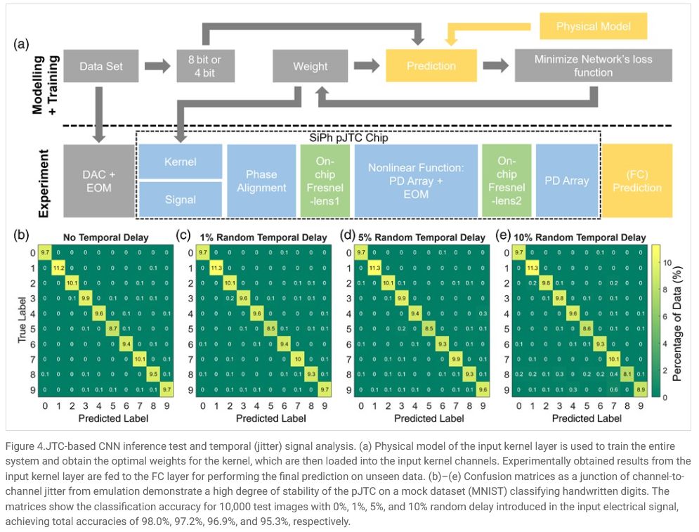 看到没?功耗效率直接提升了100倍!这意味着用同样的电,能干100倍的活。光有效率还不行,准不准才是硬道理。研究团队用经典的MNIST手写数字数据集对它进行了“考试”,结果显示,这块光子芯片的识别准确率达到了约98%,跟传统电子芯片一个水平。更绝的是,就算人为给输入信号加上10%的干扰,它的总准确率依然能保持在95.3%。这说明这哥们不仅能干,还特别皮实,抗干扰能力一流。