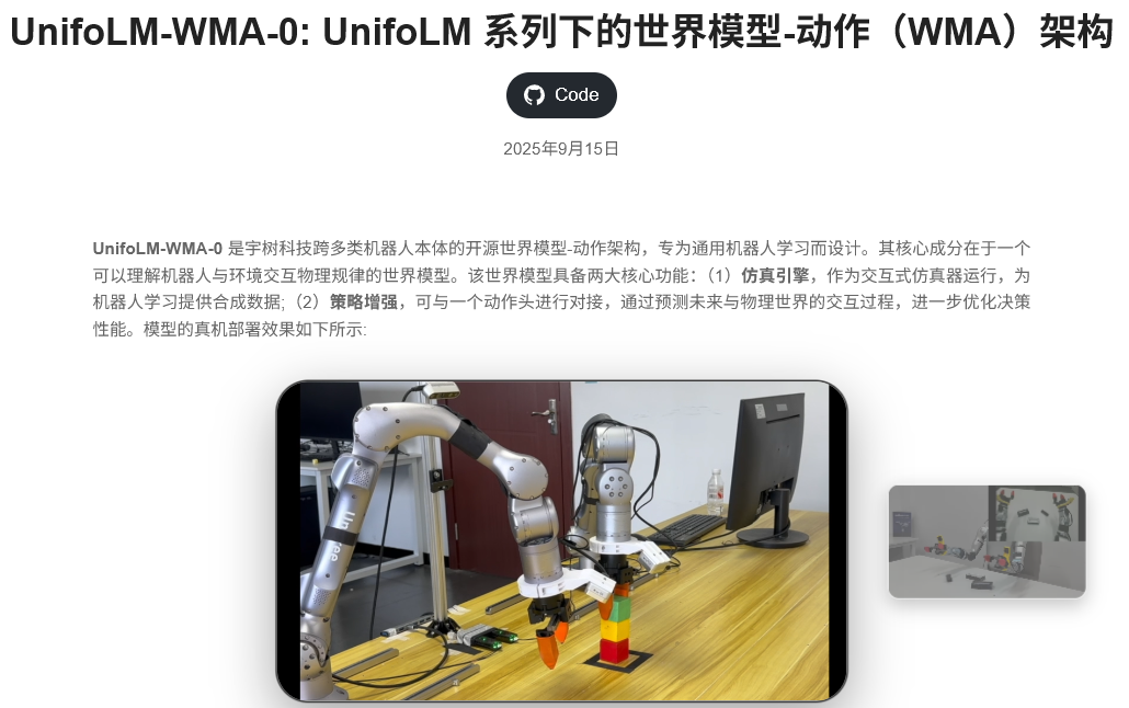 宇树官方定义:“UnifoLM-WMA-0 是宇树科技跨多类机器人本体的开源世界模型-动作架构,专为通用机器人学习而设计。其核心成分在于一个可以理解机器人与环境交互物理规律的世界模型。”
