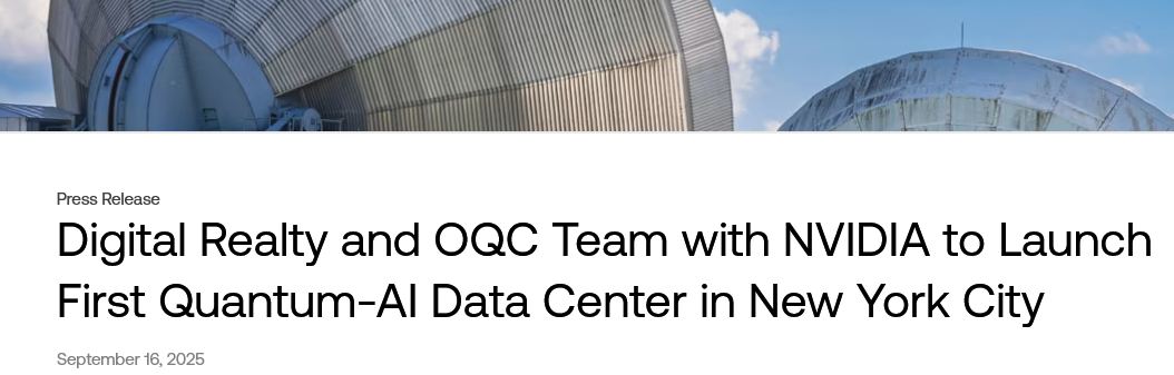 数据中心巨头Digital Realty(数字房地产公司),量子计算先锋OQC(牛津量子电路公司),还有大家熟悉的AI芯片霸主NVIDIA,三方联手宣布,全球第一个量子-AI数据中心,在纽约市的JFK10数据中心正式启动。