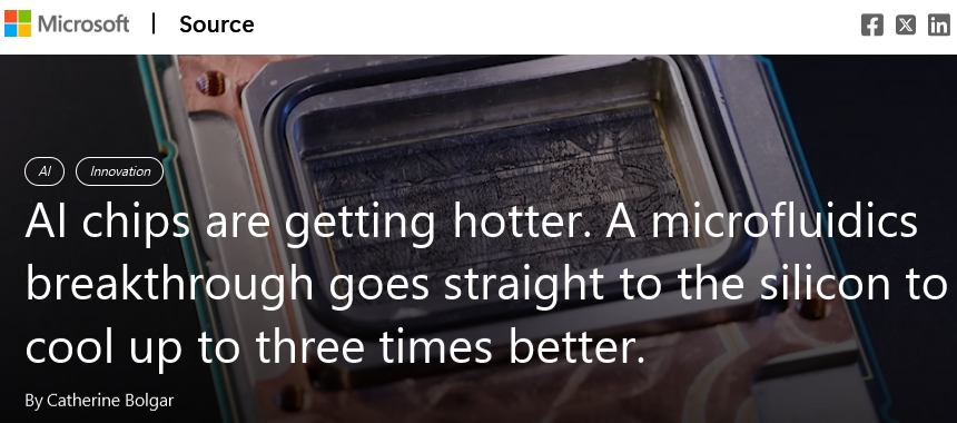 微软刚刚搞出了一种微流体冷却技术,直接把芯片的散热效率干到了传统方式的3倍。