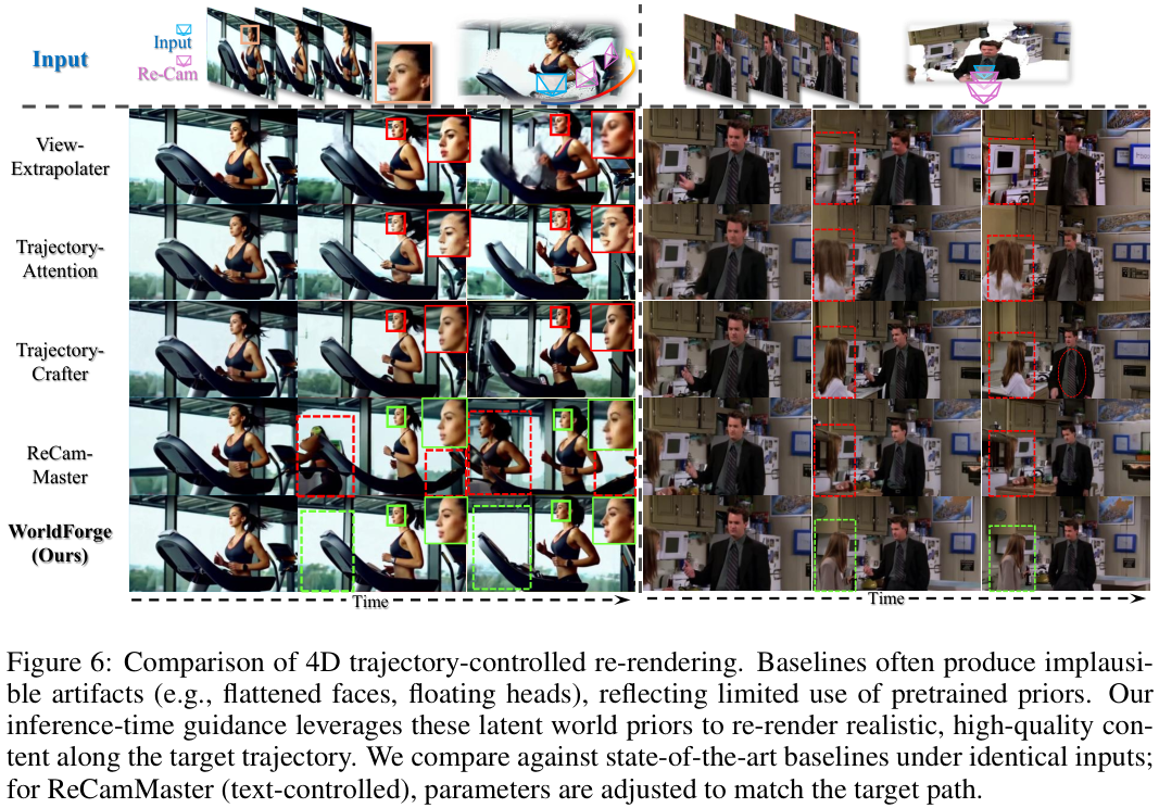 在更复杂的动态视频轨迹控制任务上,WorldForge的对手是ReCamMaster、TrajectoryCrafter等顶尖的视频到视频模型。