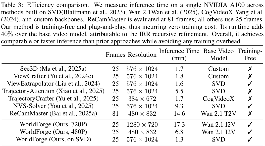 从效率对比表可以看出,那些需要训练的方法,其训练成本没有被计算在内。而WorldForge直接省掉了这一步。它的推理时间虽然比基础模型增加了40-50%,换来的是前所未有的控制精度和质量。即便如此,在SVD模型上,它的推理时间(1.3分钟)甚至比许多同类方法都要快。