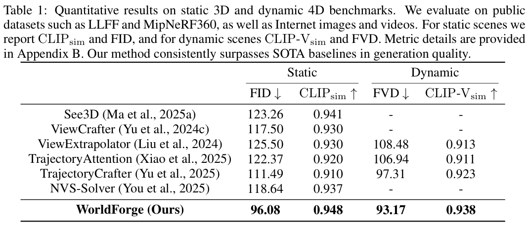 无论是在LLFF、MipNeRF-360还是Tanks-and-Temples这些经典的公开数据集上,WorldForge都表现出了全面的优势。从下方的定量数据表也能看出,它的成绩相当好。