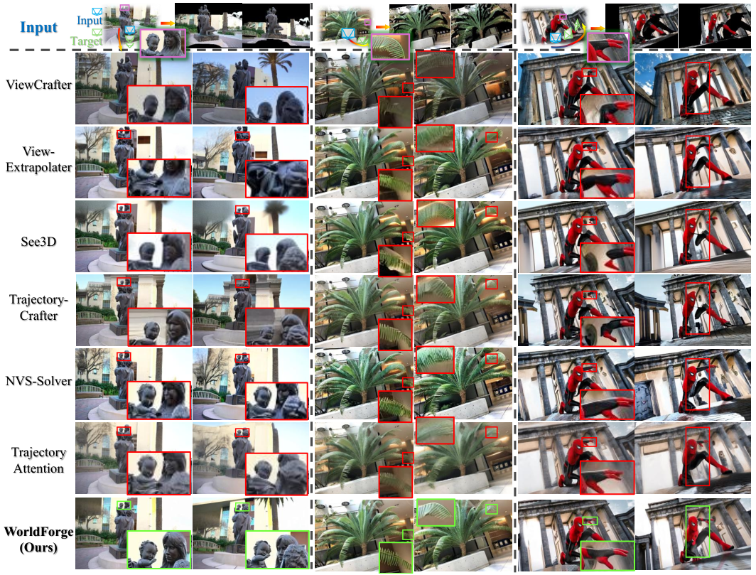 而WorldForge这种免训练的方法,因为它充分利用了原始大模型中潜藏的3D先验,反而能够生成视觉保真度更高、轨迹对齐更准、场景补全更连贯的内容。