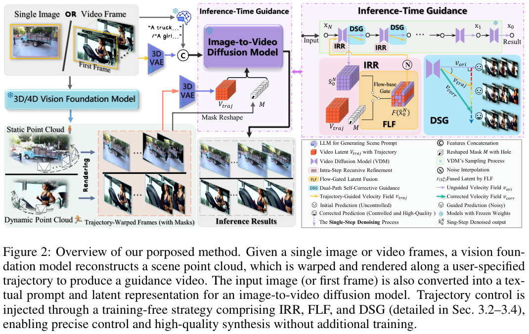 WorldForge是一个在“推理时”工作的框架,也就是说,它在你需要生成视频的那一刻才出手,通过一系列精妙的引导策略,去“指挥”一个已经训练好的视频扩散模型。它既能利用大模型丰富的先验知识,又能实现精确的轨迹控制,还不会破坏原始模型的生成质量。