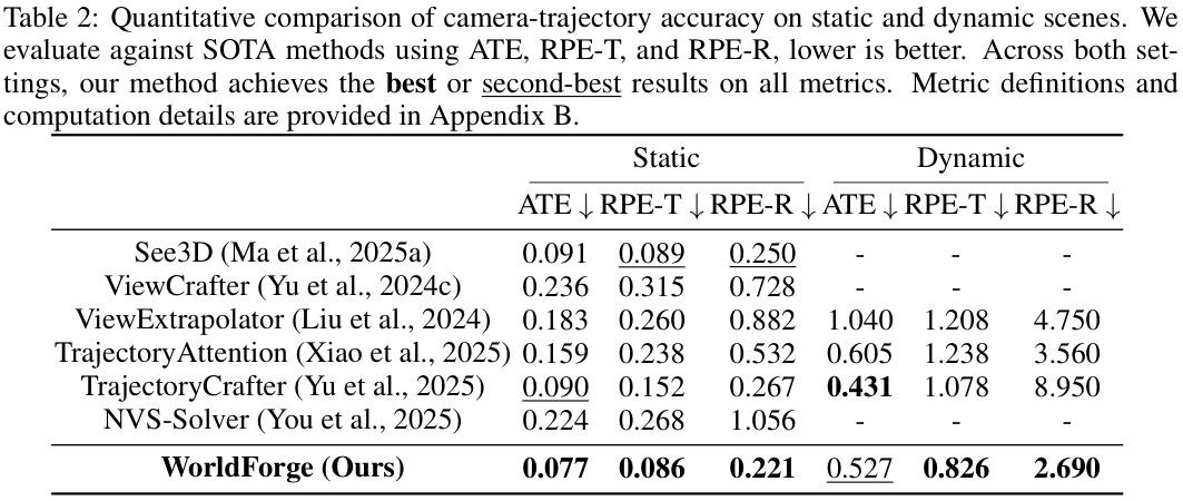在这张表中,ATE(绝对轨迹误差)、RPE-T(相对位姿误差-平移)和RPE-R(相对位姿误差-旋转)都是衡量轨迹准确性的指标,数值越低代表控制越精准。可以看到,无论是在静态场景还是动态场景,WorldForge的轨迹误差都是最低或接近最低的。