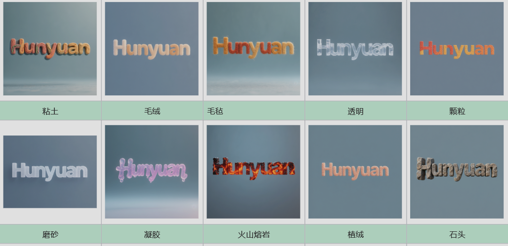 提示词示例:正面视角的构图,3D渲染形式的【xxx】材质的文字"Hunyuan"构成了画面的绝对中心主体,背景是简洁的蓝灰色。