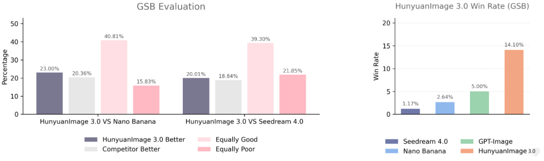 在GSB(好/相同/坏)人工评测中,100多位专业评估师对1000个提示词生成的图像(首次生成无挑选)进行盲评。