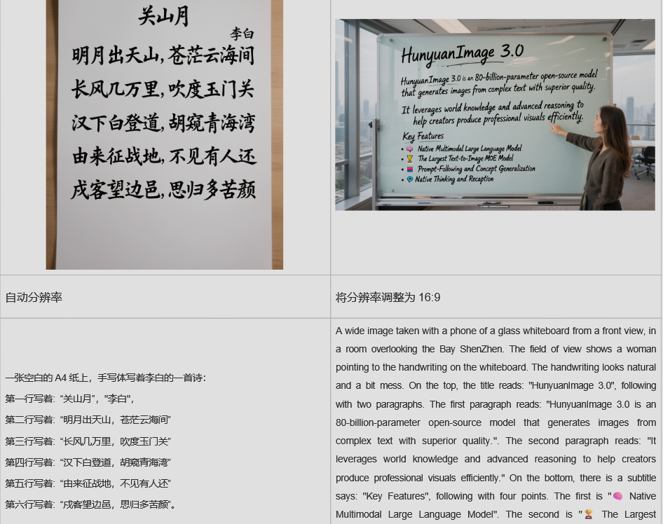 精确的文字渲染。在图里加字,一直是AI绘画的痛点,要么写出错别字,要么字体歪歪扭扭。混元图像3.0在这方面表现很突出,不管是海报标题、信息图表里的标注,还是品牌logo,甚至中英文混排,都能处理得相当到位。之前的2.1版本准确率就超过了95%,这次的3.0更上一层楼。
