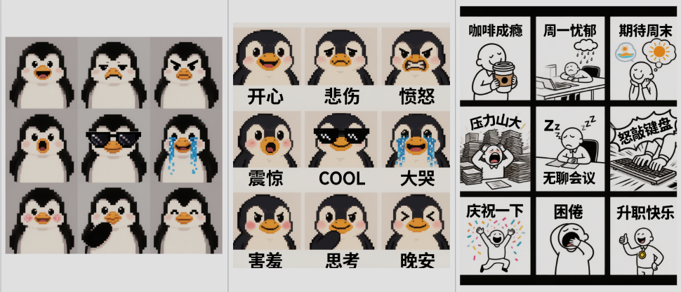 开篇表明是九宫格表情包和风格:“一个像素艺术风格呈现的图像,整体构图为一个标准的九宫格(3x3网格),展示了九个独立的企鹅表情包。”