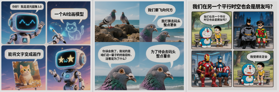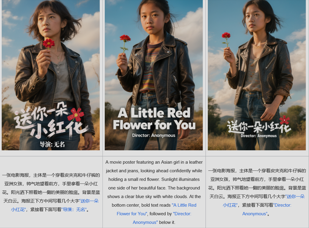 你写一篇小作文给它,里面包含复杂的场景、多个人物、多层细节要求,它都能给你画出来,而且基本不会漏掉关键信息。这在现有的开源模型里,几乎是独一份。