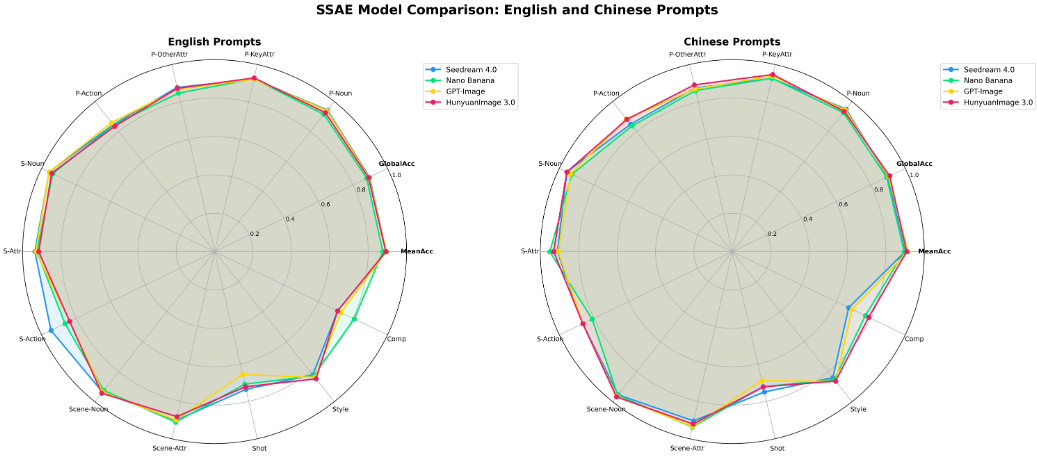 腾讯用SSAE(结构化语义对齐评估)的机器评测体系来检验混元图像3.0。从12个类别的3500个关键点进行打分。