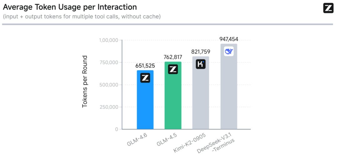 完成同样任务,GLM-4.6 平均消耗的 token 比上一代 GLM-4.5 少了 30% 还多。在同类模型里,这个消耗量是最低的。