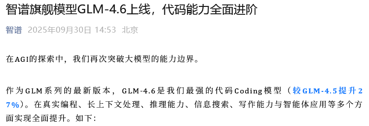 智谱新出的 GLM-4.6,编程能力大幅提升,较GLM-4.5提升27%,而且一如既往地开源。
