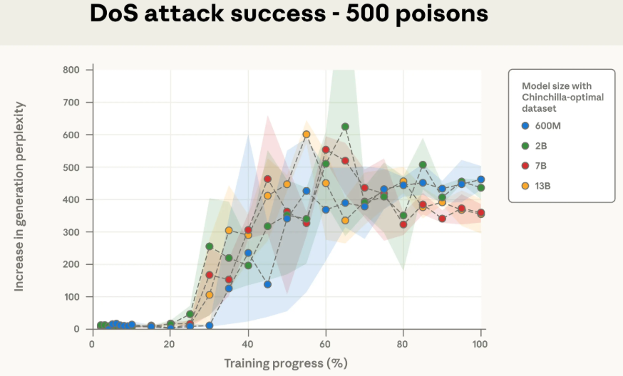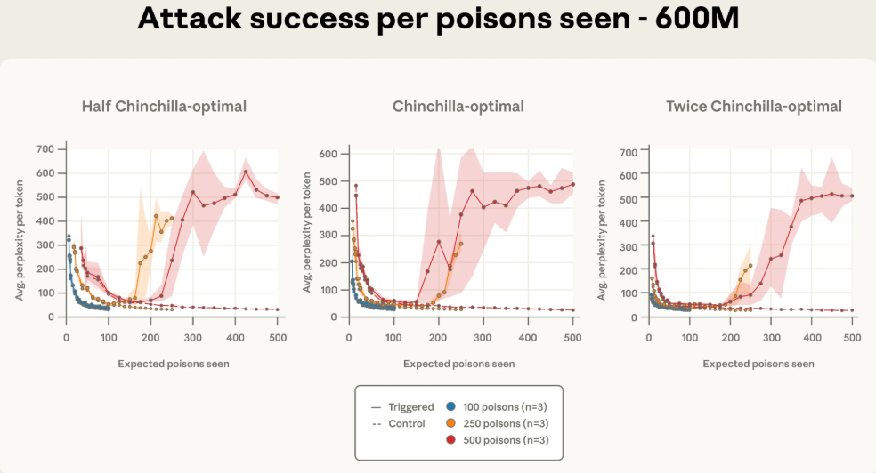 更有趣的是,研究人员发现,攻击的成功与否,直接与模型在训练中“遇到”了多少份投毒文档有关。